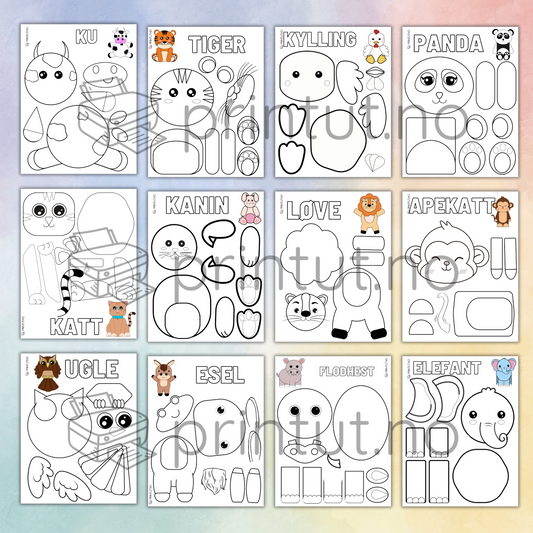 Klipp og lim – stor pakke med dyr | 12 søte dyremodeller for kreativ klipping og liming