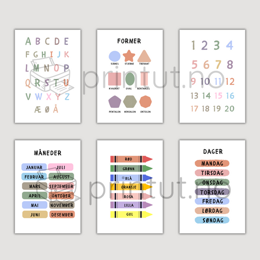 Læringsplakat-bundle (6 stk) | Fargerike og Pedagogiske Plakater for Barn