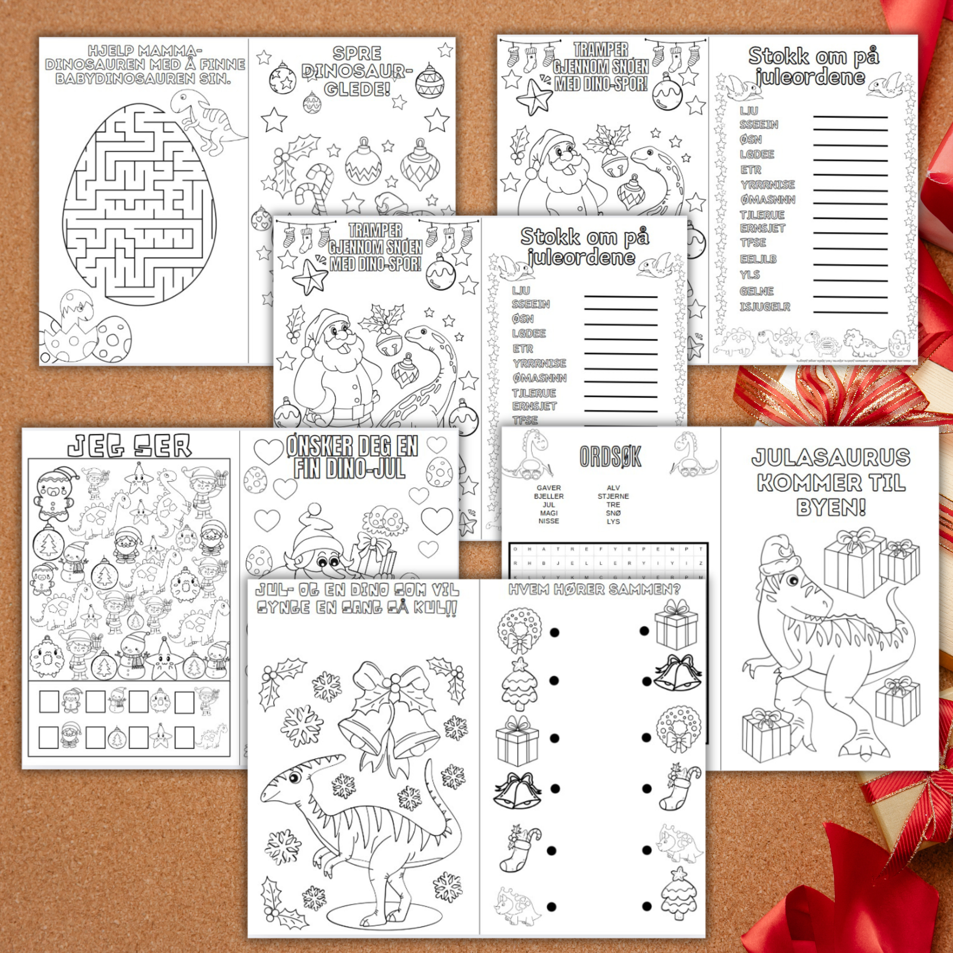 Gjør førjulstiden ekstra morsom med dette Dinosaur Juleheftet – et fantasifullt og lekent aktivitetshefte som kombinerer julemagien med barnas fascinasjon for dinosaurer! Heftet kan enkelt brettes og stiftes til en liten bok, noe som gjør det perfekt som en personlig aktivitetspakke, adventsgave, juleverkstedoppgave eller som en koselig overraskelse i klasserommet.